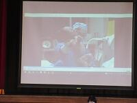 「校長式辞」と「記念品贈呈」です。在校生を代表して、5年生から「送る言葉」の動画の上映です。