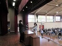 3校時は、『表彰』と『令和4年度の修了式』を行いました。今回は、3年ぶりに体育館で行いました。全校児童が体育館に集まるのは、しばらくぶりです。子どもたちは、慣れていなかったのか、きょろきょろとしていました。