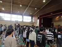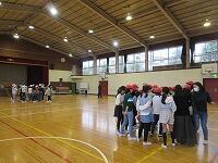 体育館に集まって、説明を聞いています。始める前にみんなで気合!を入れました。