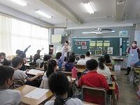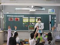 最後に、今日学習したことを振り返って、これから頑張りたいことをワークシートに書きました。子どもたちからは、「野菜にそんなパワーがあることを知らなかった。」「好き嫌いをしないで、野菜をもっと食べます。」など、発表しました。そして、「給食には、毎日たくさんの野菜が使われている」ことに気がつきました。栄養士の加藤先生、今日は、ありがとうございました。