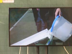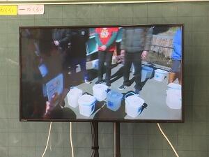 これは、給食室から出る「食べ物のごみ」です。「これは何かわかりますか。」「キャベツの芯」や「外側の葉」の部分。「玉ねぎの皮」などです。子どもたちは、映像に見入っていました。