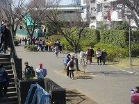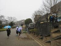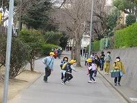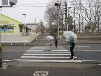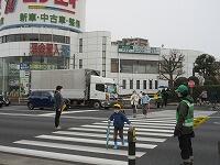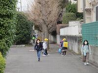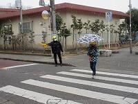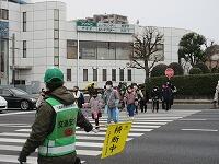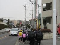 歩道が狭い所は、横に広がらずに気をつけて歩きます。交通推進隊の方にもあいさつをしています。