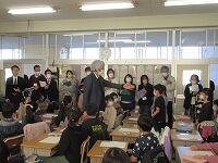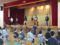 青木校長先生の話です。「旧児童会役員の皆さん、今まで本当にありがとうございました。そして、新役員の皆さん、これから1年間よろしくお願いします。松一小がより良くなるために力を貸してください。頼みます。」最後は、手を振って『児童会役員引き継ぎ式』が終わりました。