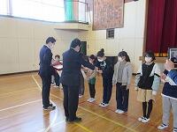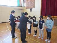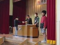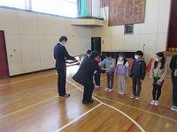 続いて、松一小児童会の「かぎ」の引き継ぎです。旧役員から新役員へ「かぎ」を手渡しました。