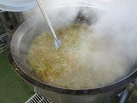 「これは、松一小のある日の給食です。」「学校全体で給食がこれだけ残りました。」「牛乳が、約40本。キャベツと厚揚げのみそ炒め丼が、5.4kg(約24人分)。それから、・・・。」