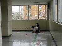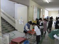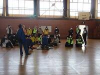 「もしもし、大丈夫ですか?」「・・・。」「反応なし。」「誰か来てください。」「あなた、119番をお願いします。」「あなた、AEDを持ってきてください。」学校では、毎年、職員が「心肺蘇生法の講習」を受けています。また、5・6年生は、「ジュニア救命士講習会」を実施しています。