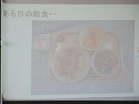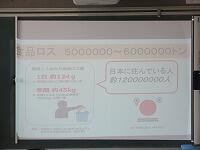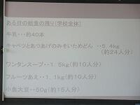 「これは、松一小のある日の給食です。」「学校全体で給食がこれだけ残りました。」「牛乳が、約40本。キャベツと厚揚げのみそ炒め丼が、5.4kg(約24人分)。それから、・・・。」