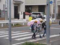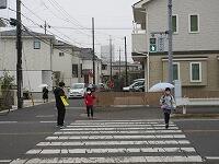 歩道が狭い所は、横に広がらずに気をつけて歩きます。交通推進隊の方にもあいさつをしています。