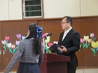 卒業生の皆さん、御卒業おめでとうございます。中学校へ行っても目標を持って、元気に活躍してください。応援しています。