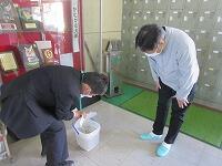 青木校長先生が、ロータリークラブの方に、「よろしくお願いします。」と、「さけの稚魚」を預けました。