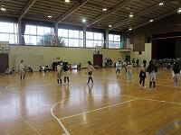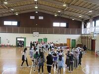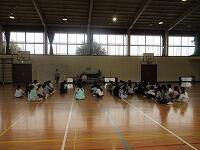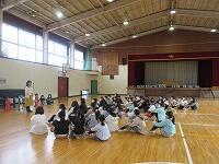 体育館に集まって、説明を聞いています。始める前にみんなで気合!を入れました。