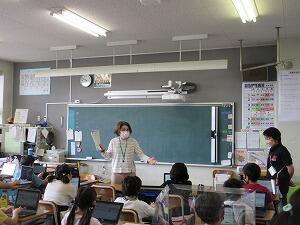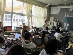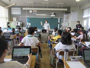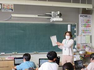 今日は、4年生が、『図書学習』を行いました。図書館指導員の野崎先生が、電子版の百科事典の使い方を指導しました。調べたい「キーワード」や「項目」を入力して検索していきます。