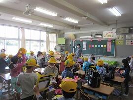 2年生の様子です。頭をしっかりと守っています。訓練の振り返りでは、防災頭巾の被り方も確認しました。