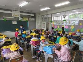 1年生の登校2日目。今日は、ランドセルに入れるノートや教科書の入れ方や防災頭巾の被り方等、学校でのルールの確認をしました。