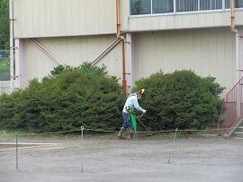 用務員の山中さんが、周りの草を刈っています。6校時に、6年生を中心に「準備作業」を行いました。