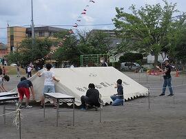 テント係は、指を挟まないように気をつけながら、テントを張っています。