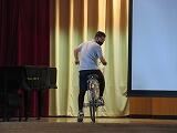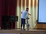 岩田先生が、自転車の乗り方のお手本を見せています。みんなも自転車があるつもりで。