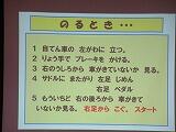 山田先生が、道路を渡る時のお手本を見せています。道路を渡る時は、一度止まって、「右、左、右」を確かめて、「しっかりと手を挙げて」渡ります。