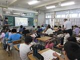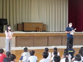 次に、生徒指導主任の平良先生から、「夏休みの生活」について、話があり、生活委員会が作成した「夏休みの過ごし方」の「ビデオ」を上映しました。「すいか」の合言葉です。