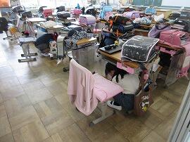 『訓練。訓練。「緊急地震速報」ただいま、緊急地震速報が入りました。児童は机の下にもぐり、安全を確保しましょう。』「シェイクアウト!」第一次避難です。
