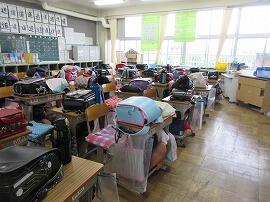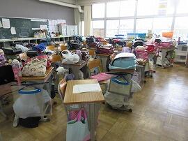 「大きな揺れは収まりましたが、まだ、余震が続く可能性があります。先生の指示に従って、兄弟姉妹の一番下の児童のいる教室に落ち着いて避難しましょう。」