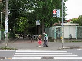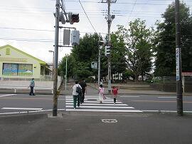 信号が青でも左右を確かめて渡ります。松葉第四公園前のこの場所の歩行者用信号機は、10秒ほどで変わってしまいます。