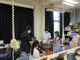 理科室をスタジオにしています。児童会役員が、廊下で、リハーサルをしています。