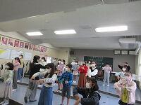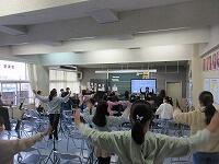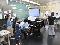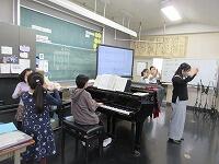音楽主任の野﨑先生が、「ボールが跳ねるようにするところと、鳥が羽ばたくようにするところがあります。強弱をつけるところでは、・・・。」と、美しい形の指揮になるよう、子どもたちに指導していました。「もう少し、腕の位置をあげてみてください。」「足は、左右に揺らさないように。」