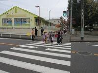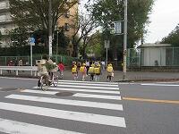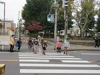 松葉第四公園前の横断歩道の登校の様子です。以前、歩行者用信号機の「青信号の時間」が長くなったことをお知らせしました。その後、どのようにしているのか、登校の様子を見守りました。