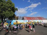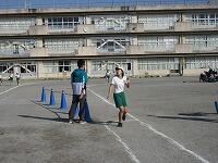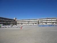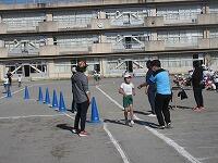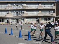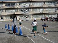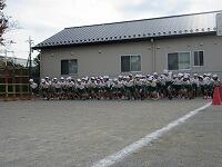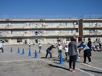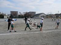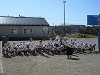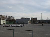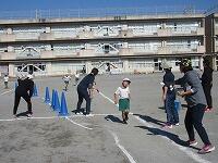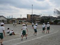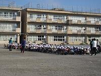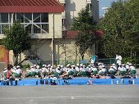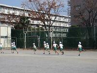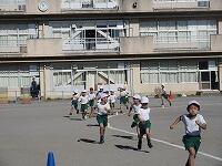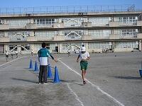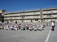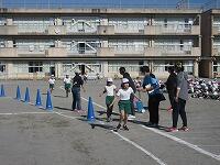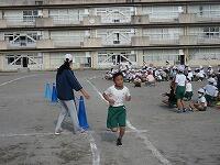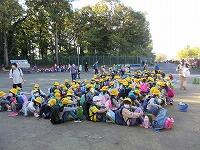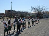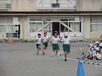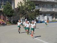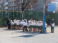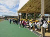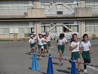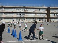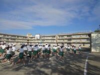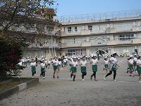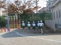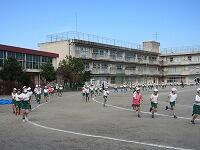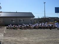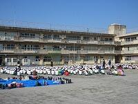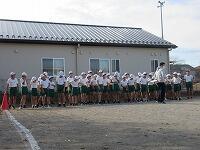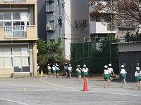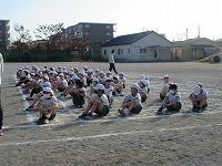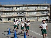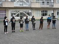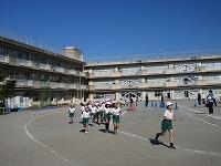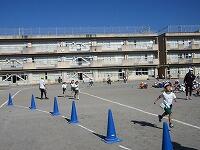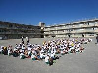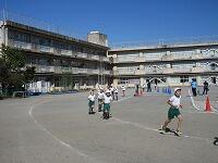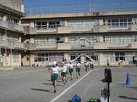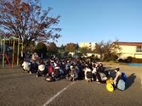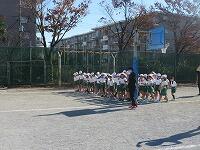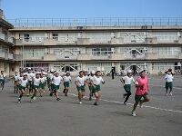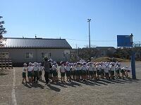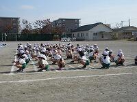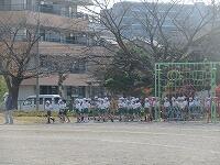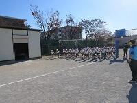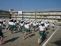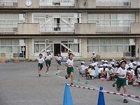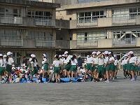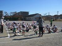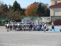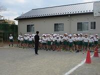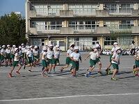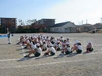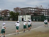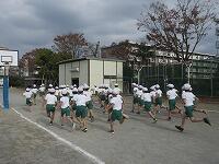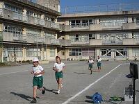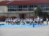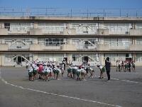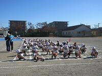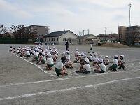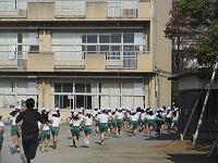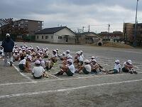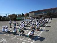 走り終わったら、元の場所に戻って、整理運動です。1年生は、準備運動も整理運動も学年全体で行います。