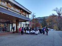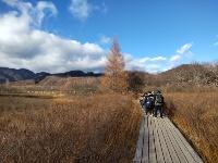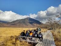 「戦場ヶ原ハイキング」をしました。ちょっと肌寒かったですが、天気は最高で、とても気持ちよく、マイナスイオンを浴びてさらに元気になりました。全員で2時間半歩き、ゴールの「湯滝」に着きました。