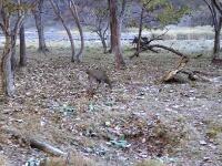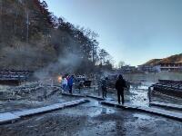 源泉の散策です。硫黄の匂いがすごいです。木道は、霜で真っ白でした。帰り道に鹿がいました。