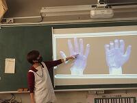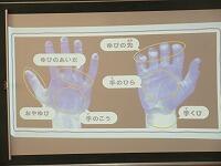 1年生が、『手あらいじっけん』をしました。手洗いの大切さを考えるためです。よーく手を洗ったつもりでも、まだまだ手には、汚れが残っています。しっかりとした洗い方を覚えるときれいに手を洗うことができます。クリームを塗ってから手を洗い、ライトを当てて確かめてみます。