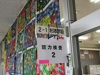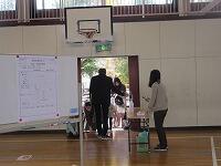 体育館に入って手指消毒と検温をしてから受付をします。いつもは、5年生や6年生の誘導係の子どもたちが、案内をするところですが、コロナ禍の状況のため、昨年度と同様に、教職員で対応します。今年は、3グループに分け、さらに3・4人の小グループを作って保護者と一緒に、(歯科)→(内科)→(聴力)→(視力)→(簡易知能検査)→(面接)の順で、検査会場を移動しました。