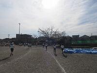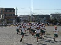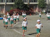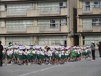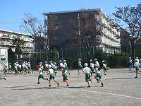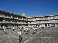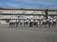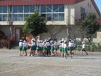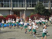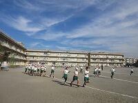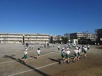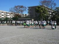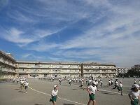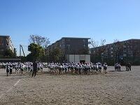 走り終わったら、元の場所に戻って、整理運動です。1年生は、準備運動も整理運動も学年全体で行います。