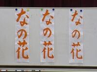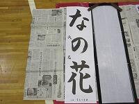 3年生の課題は、「なの花」です。「床に墨を垂らさないように、硯も新聞紙の上に置きます。」