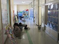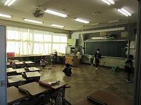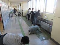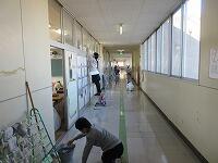 教室の床を入念に拭いています。まずは、掃き掃除からです。廊下や流しもしっかり磨いています。