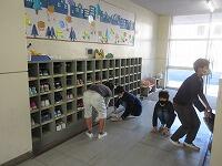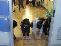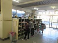 机や椅子の脚のゴミを取っています。昇降口では、丁寧に砂などを集めていました。給食の配膳台もきれいにしています。