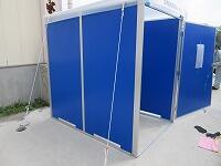 下の写真は、今年の5月に、松葉第一小で行った『防災トイレ使用方法の説明と設営』の様子です。2か所あるうちの1つを本校の職員3名で設営してみました。