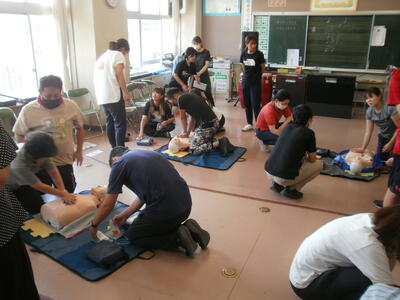 4つのグループに分かれて全員が心臓マッサージとAEDの使い方を実践しました。