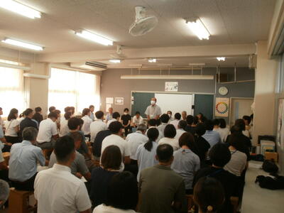8月21日松葉一小に松葉二小、松葉中の職員全員が集まり、松葉中学校区の小中学校全体の研修を行いました。