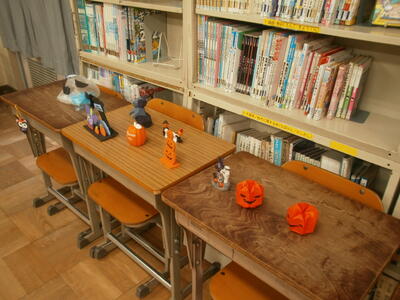 お昼休みに図書室に行ってみました。入り口からいつもと違う雰囲気がします。