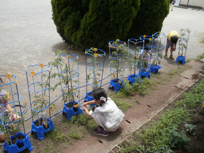 「7つ実がなった!」「実がこんなに大きくなった!」「葉っぱがしおれている」「実がとれちゃった」色々言いながらトマトに水をあげたり写真を撮って記録していました。