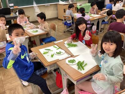 自分たちが食べる食材を実際に触る機会も大切ですし、食材に対して愛着を持てば、食べ物を大切にするようになりますね。むいたグリーンピースは給食でおいしく食べました。