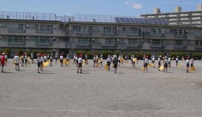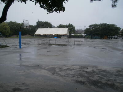 校庭は水浸しです。でも体育館では運動会練習。今日は涼しくてよかった!