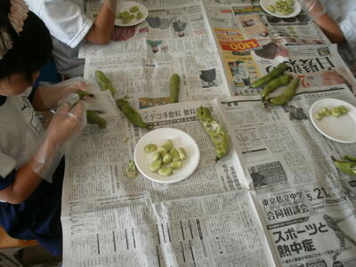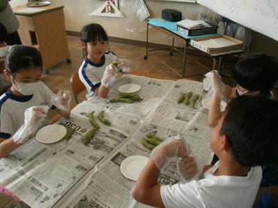 前回は1年生でグリーンピースでしたが、今回は2年生がそら豆の皮をむくという授業です。