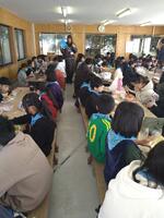 松葉地区の避難所についてや、防災グッズについてお話をいただき、後半に簡易ベッドの感触をたしかめる体験を行いました。