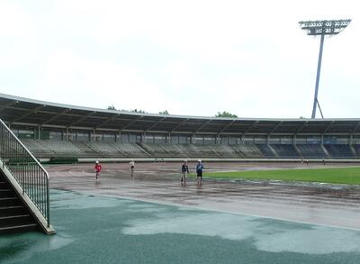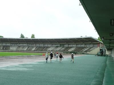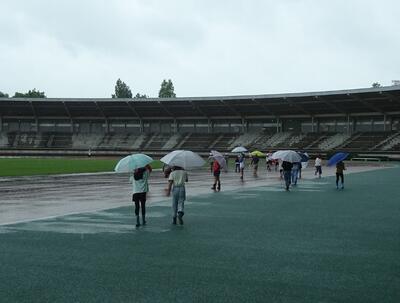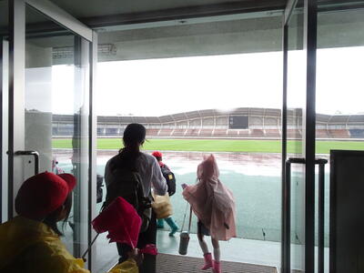 競技場の方から「トラックを歩いていいです」と言われていたので、食後は少し雨が降っていましたがここぞとばかり400mのトラックを走っている子もいました。
