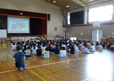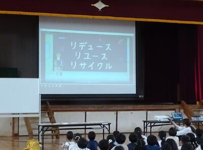 今日は4年生がゴミ減量出前授業を行いました。柏市のリサイクルリボン館の方に来ていただき体育館で話を聞きました。