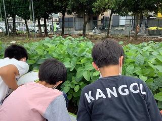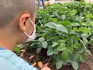枝豆の観察をしました。数週間前,“さくひまなのこすたん”で雑草抜きと肥料をあげた時には見られなかった実が、たくさんできていました。